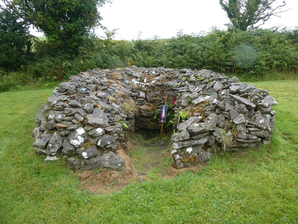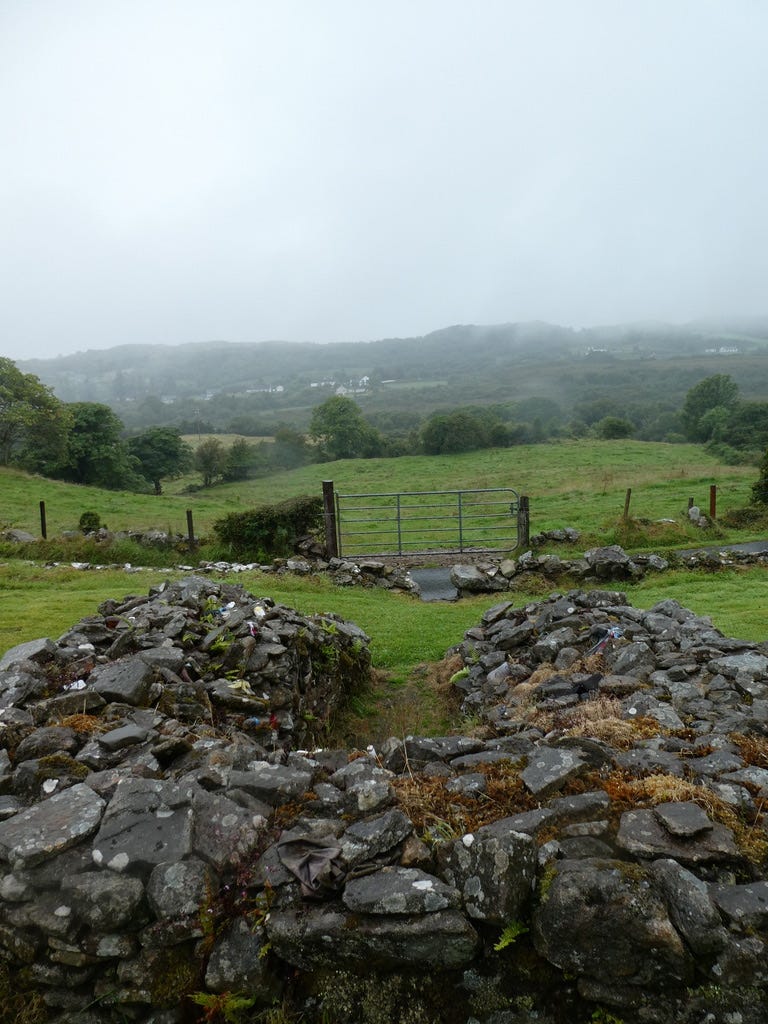 Up a remote lane on a hillside, in a misty valley on a misty day, my son and I, still on our camping-n-fishing tour of Donegal last summer, found a silent horseshoe of stone which my map informed me was a holy well. I drove past it at first, maybe taking it for a sheep pen or a remnant of stone wall. It sits low on the grass at the side of the road. There is no statue, no rag tree, no signpost. Just this little curve of stone, looking for all the world like some ancient barrow, gazing out over the valley in the drifting cloud: