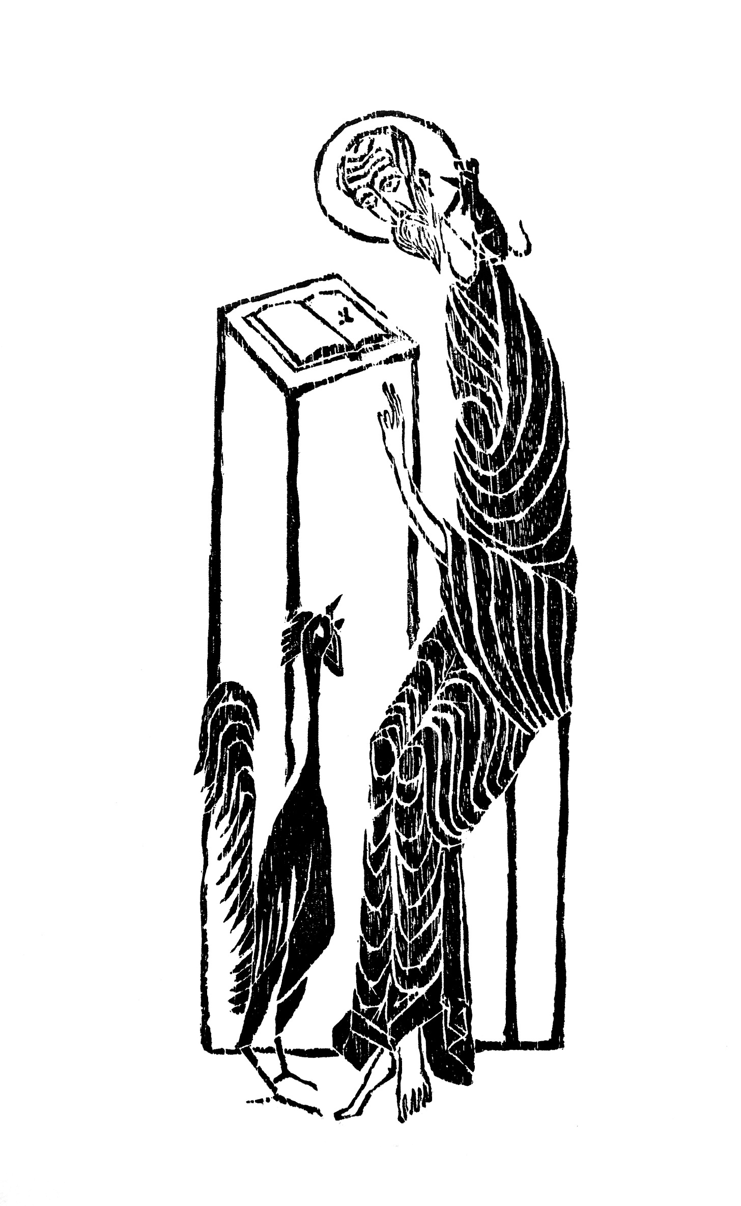 This work for Paul came about as I was reading his words on the Irish saint Colman Mac Duagh. I was incredibly drawn to the imagery of this saint, especially the little mouse biting his ear to keep him alert. I responded to this by making a woodblock print. Upon completing it, I thought Paul may like to see it - and thankfully it has led to some very exciting work for the Abbey of Misrule. I will be illustrating each of Paul’s forthcoming pieces on the wild saints with similar woodblock prints, each of them created especially for the story.