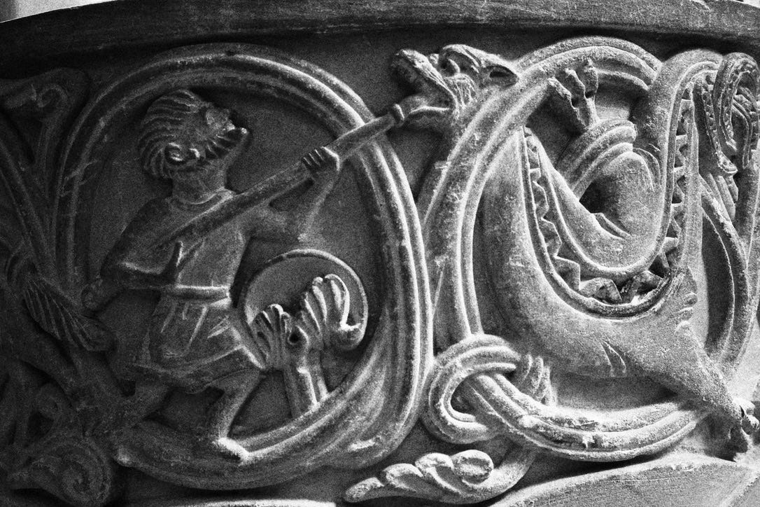 The older parts of the church, which was extended later in the middle ages, have plenty of fantastic stonework to choose from. Behold the font: