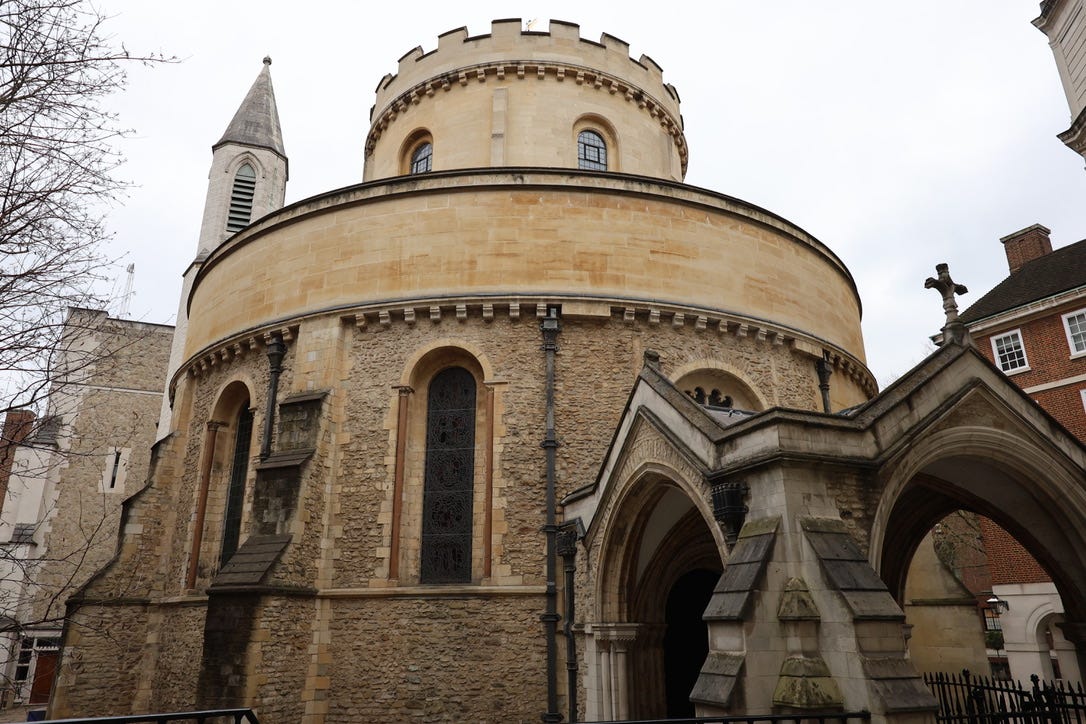 But this - as we can see from the quality of its clientele - is not just any church, and its roundness is not the only thing that makes it unusual. The Temple Church is a thousand-year-old Romanesque-Gothic mashup, inspired by the Church of the Holy Sepulchre in Jerusalem, and founded by an order of secretive crusading knights who may or may not have worshipped cats and known the location of the Holy Grail.