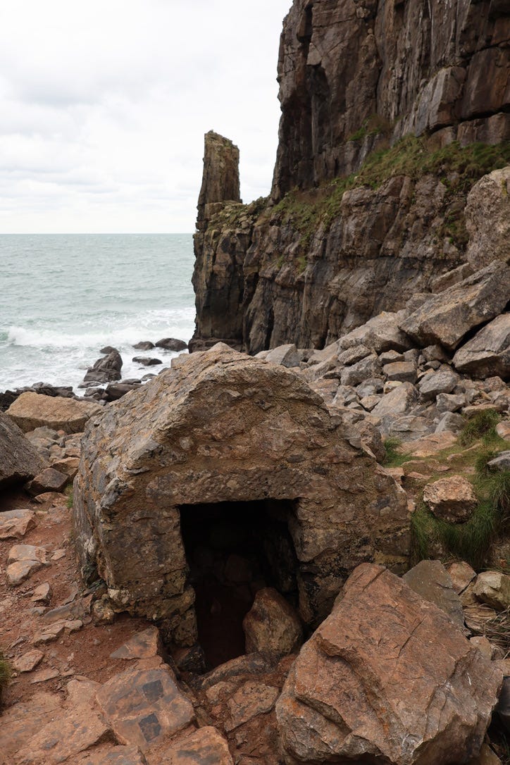 The most popular version of the story of Govan is that he was a wandering monk, possibly from Ireland, who pitched up in the wilds of Pembrokeshire and settled down to a hermit’s life. The seas back in those days were plagued with pirates and slavers - Irish pirates and slavers to be precise, of the kind who kidnapped St Patrick from Britain and took him by force to the land that would make his name. One day, it is said, Govan was menaced by a group of them, and they pursued him up the beach, intending to capture and sell him too. Luckily, a miraculous crack opened up in the rocks: Govan slipped into it, it closed again around him, and the pirates were foiled. This is the cleft in the cliff which we saw in the photo above. They say that if you look closely enough, you can still see the imprints of the saint’s ribs in the rock.