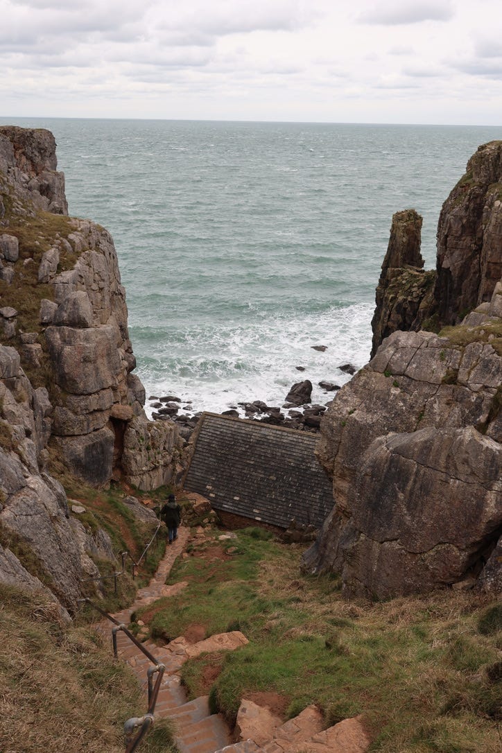 At the bottom of the steps, you find yourself level with the chapel’s roof. The building is literally wedged into a crack in the sandstone cliffs of South Wales, so that it looks as if it has grown from them :