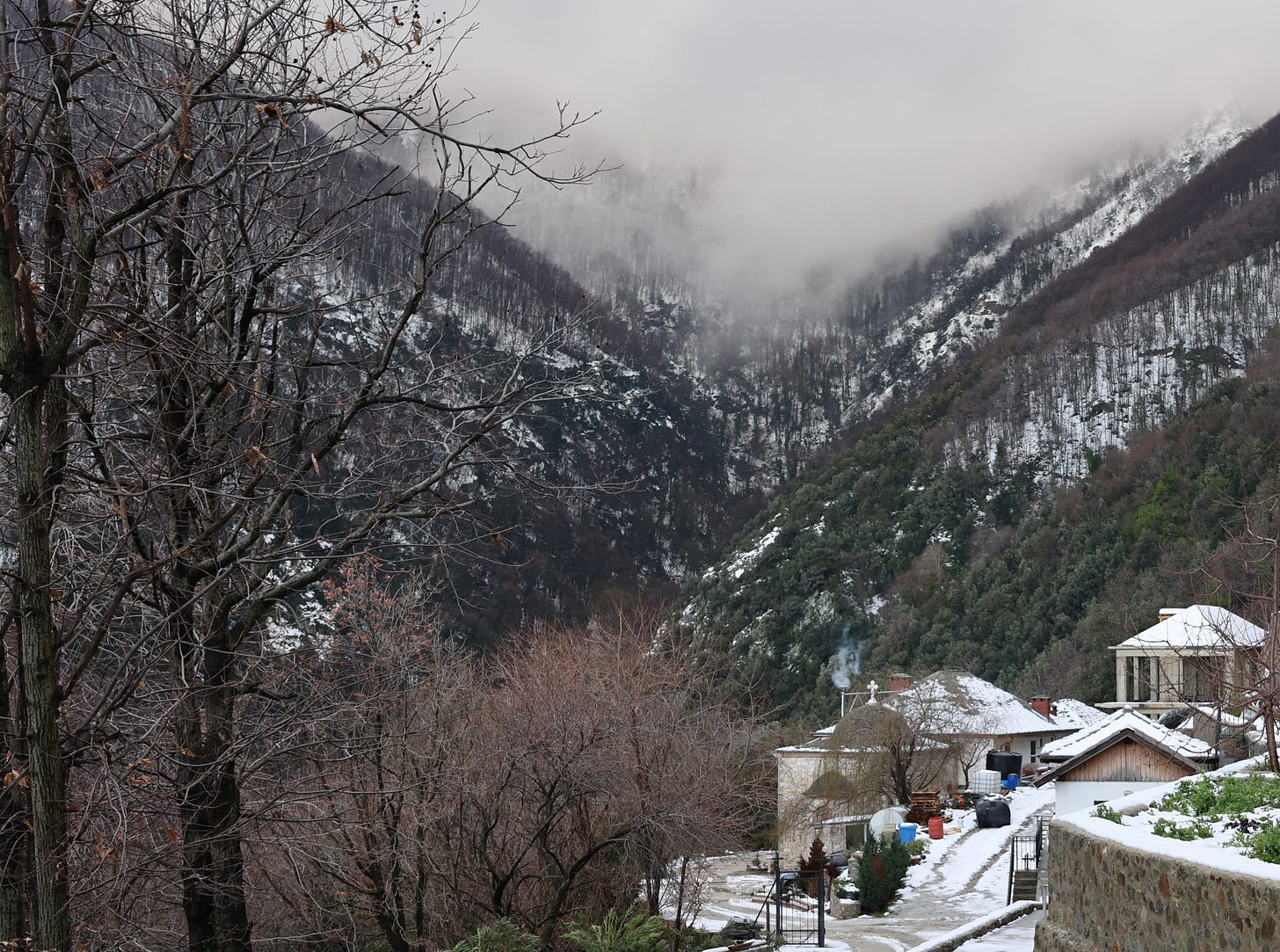 Speaking of souls, English or otherwise: in January I spent a week on Mount Athos, the Orthodox monastic republic in Greece. It was my second visit - I wrote about the first one, in 2022, here, and about this more recent one, and the silence it brought me, here. This time around, I visited Lakkoskiti, a remote Romanian skete (a skete is a kind of mini-monastery) nestled beneath the peaks of the peninsula’s Holy Mountain, high up in the winter forest:
