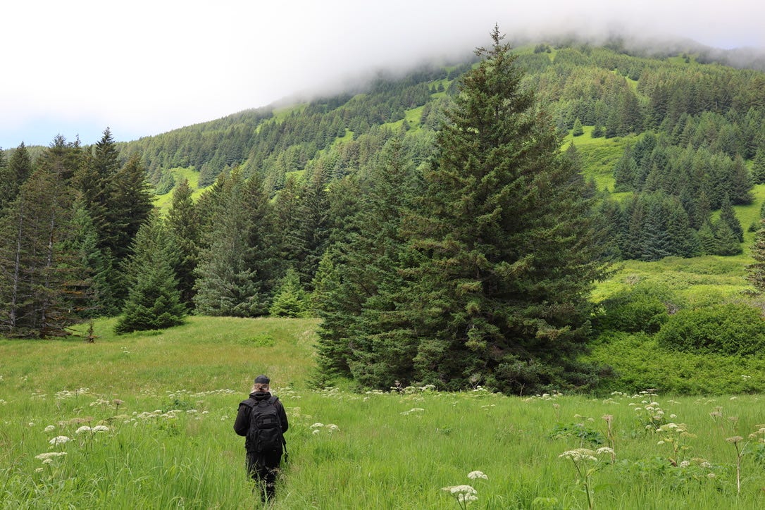 My daughter and I both pray at the grave site. Then we all picnic outside the church before Fr Adrian leads us through an open meadow studded with iris and salmonberry that looks like it ought to be in the Alps rather than in Alaska.