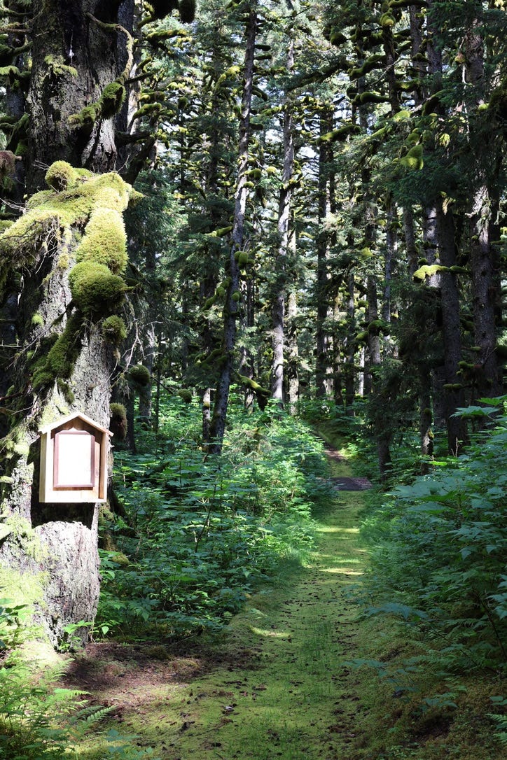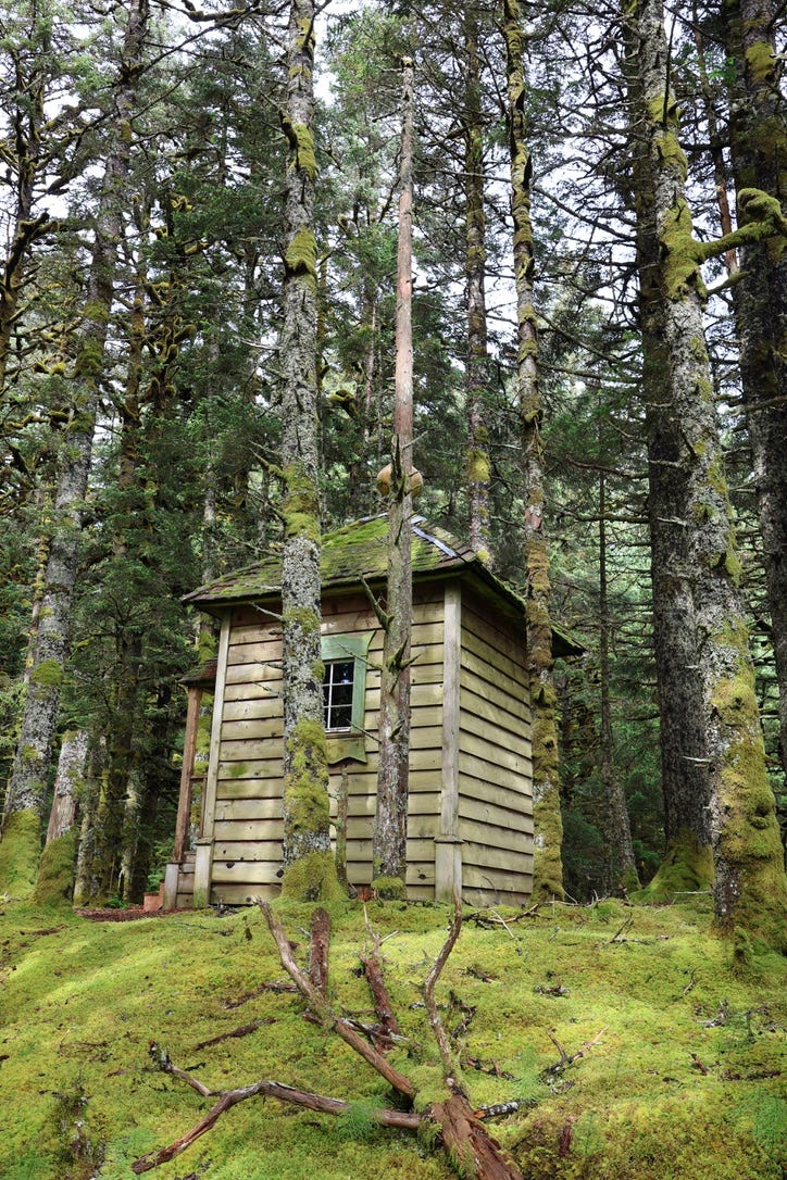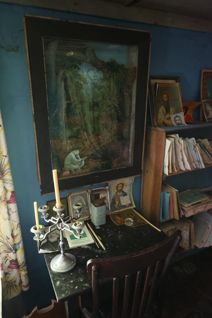 Deep in the forest, we pass the cell of Fr Gerasim Schmaltz, whose life deserves an essay all of its own (and in fact you can read one here.) He was a Russian monk who was sent to Alaska in 1916, only to be stranded here when the Bolshevik revolution happened. He lived the rest of his life on Spruce Island, often entirely alone (the current monastic brotherhood arrived later, in the 1980s), and his cabin has been preserved as it was on his death in the 1960s, complete with books, his own small chapel, and a series of beautiful natural dioramas he made with moss and twigs from the forest, perhaps to help the dark winters pass by more easily: