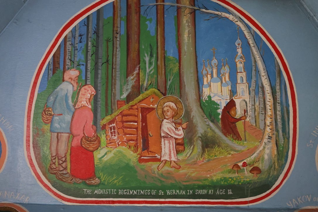The building was restored in the 1990s, and the monks painted a series of little frescoes inside, telling the story of St Herman’s life. I love the simplicity of them. They are like children’s paintings, in the best possible way: