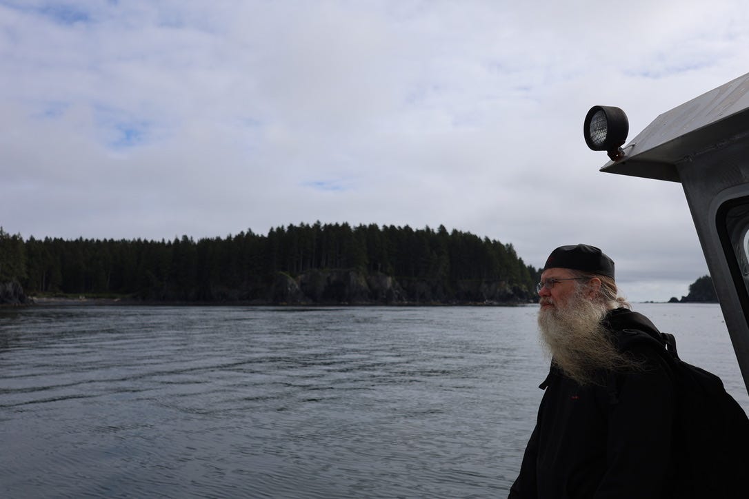 Today, a small brotherhood of five monks lives on Spruce Island all year round in the St Archangel Michael Skete (a skete is a small monastery). We were met at the docks in Kodiak by Father Andrew, the Abbott, piloting the monastic skiff: