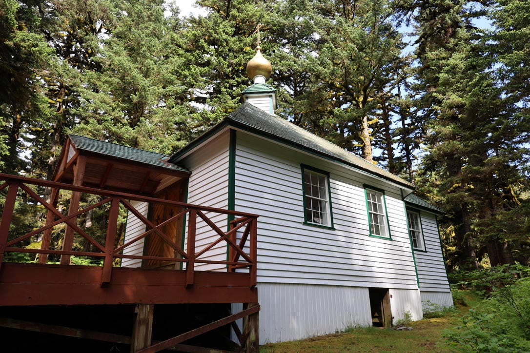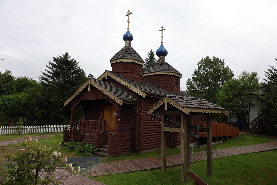 The first stop on the St Herman pilgrimage route, such as it is, is the tiny wooden Orthodox cathedral in Kodiak, whose onion domes peek out from behind the oil terminal that blocks the church from the sea. Inside the church are the relics of St Herman, which were transferred here from Spruce Island some years after his death. On top of the wooden casket containing his remains are perched his hat and the metal cross that he wore every day: