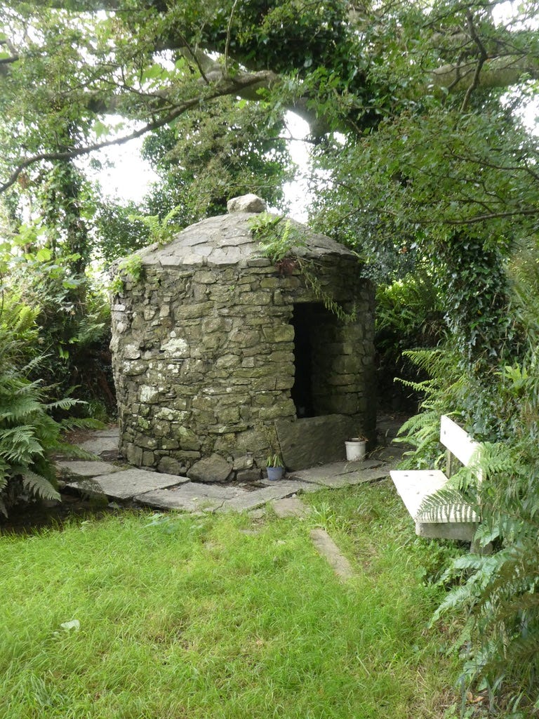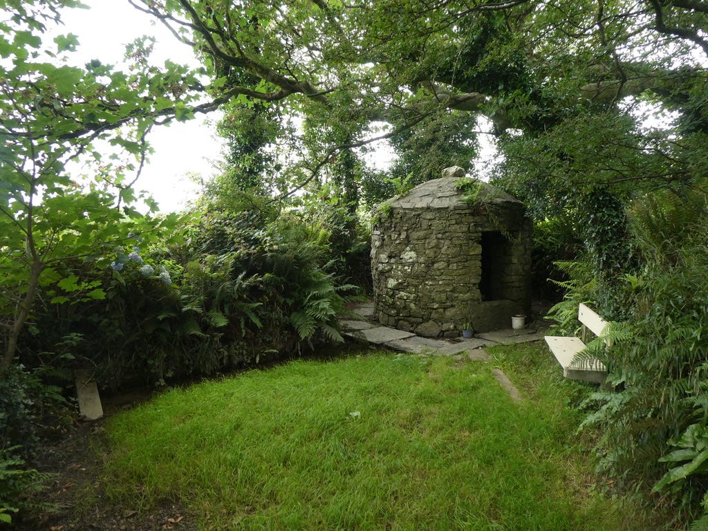 At some point, presumably as part of the post-curse restoration project, a wellhouse was built. It’s an interesting one, because it’s built in the shape of a clochán, otherwise known, in English, as a ‘beehive hut’: